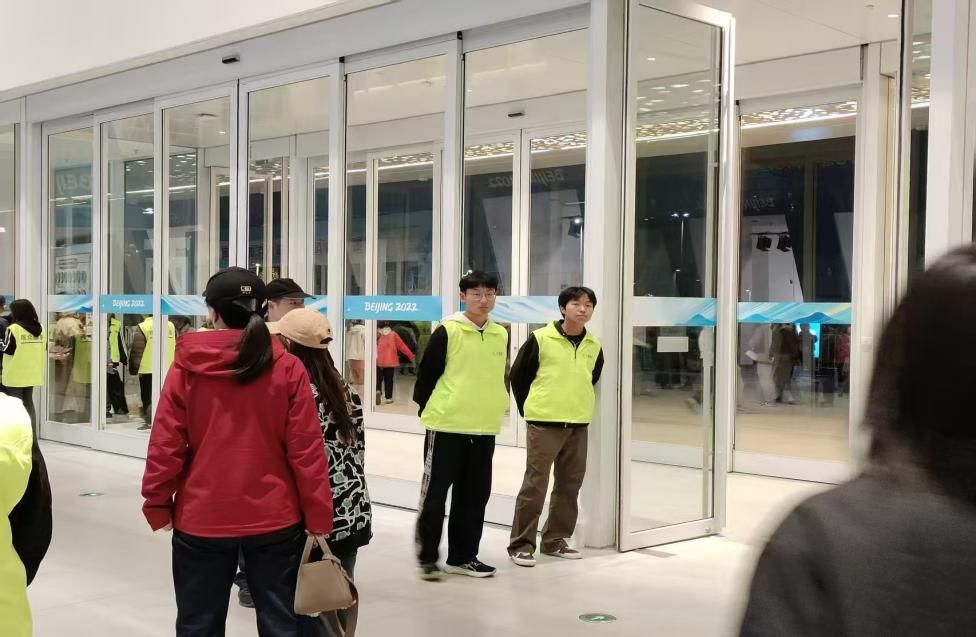 秋风涟漪,天空明朗。12时10分,志愿者们兴致高昂,在北京速滑馆门口集合,换上志愿者的马甲,听从工作人员的安排,进入馆内,准备开始志愿工作。
